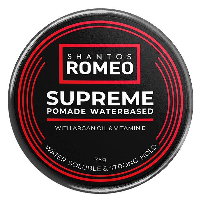 Supreme Pomade Water Based, pomade berbahan dasar air yang memiliki tingkat kekuatan/hold yang tinggi dan memberi kilau/shine pada gaya rambut sepanjang hari, diperkaya dengan argan oil dan vitamin E. Performa penggunaan Shantos Romeo Supreme Pomade Waterbased sangat mudah dibersihkan oleh air.